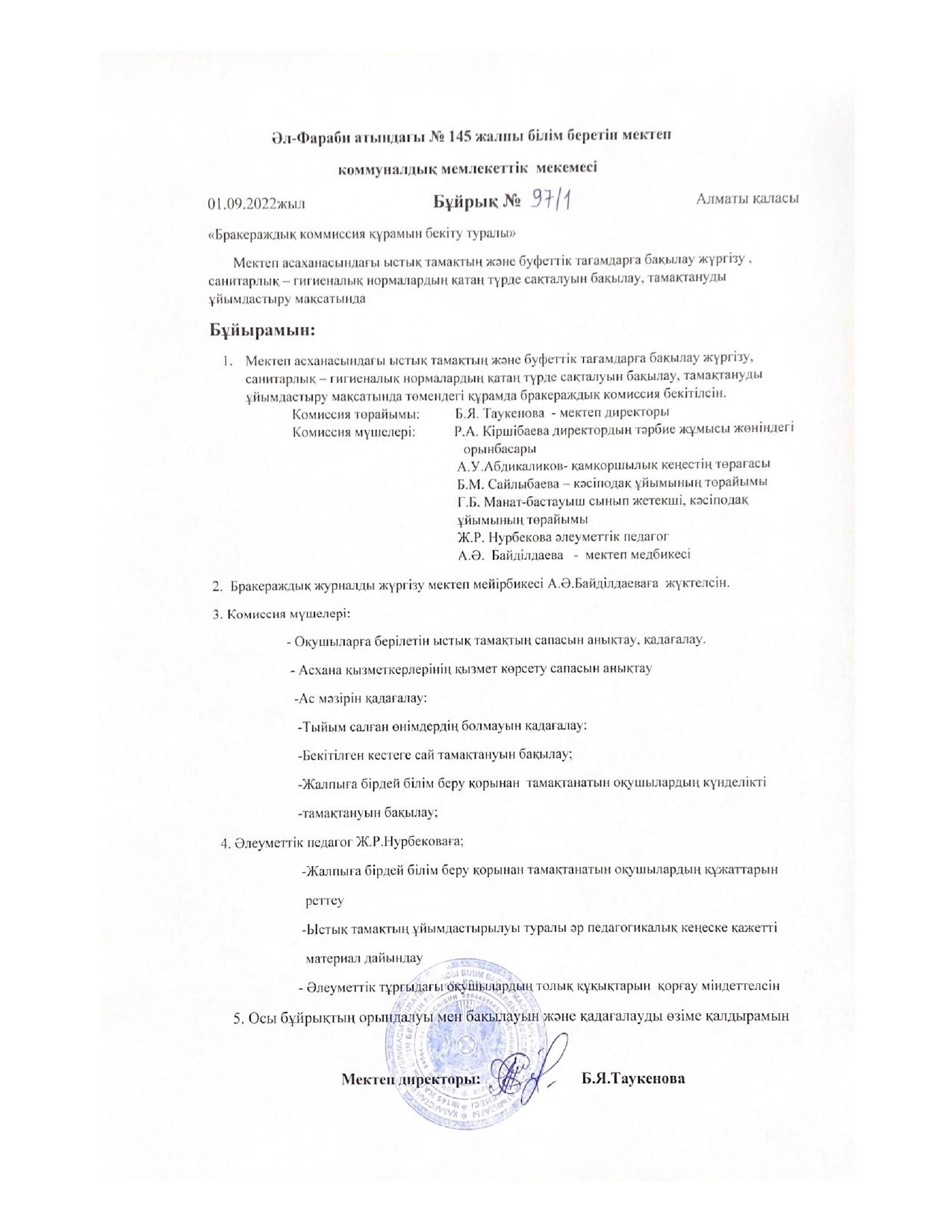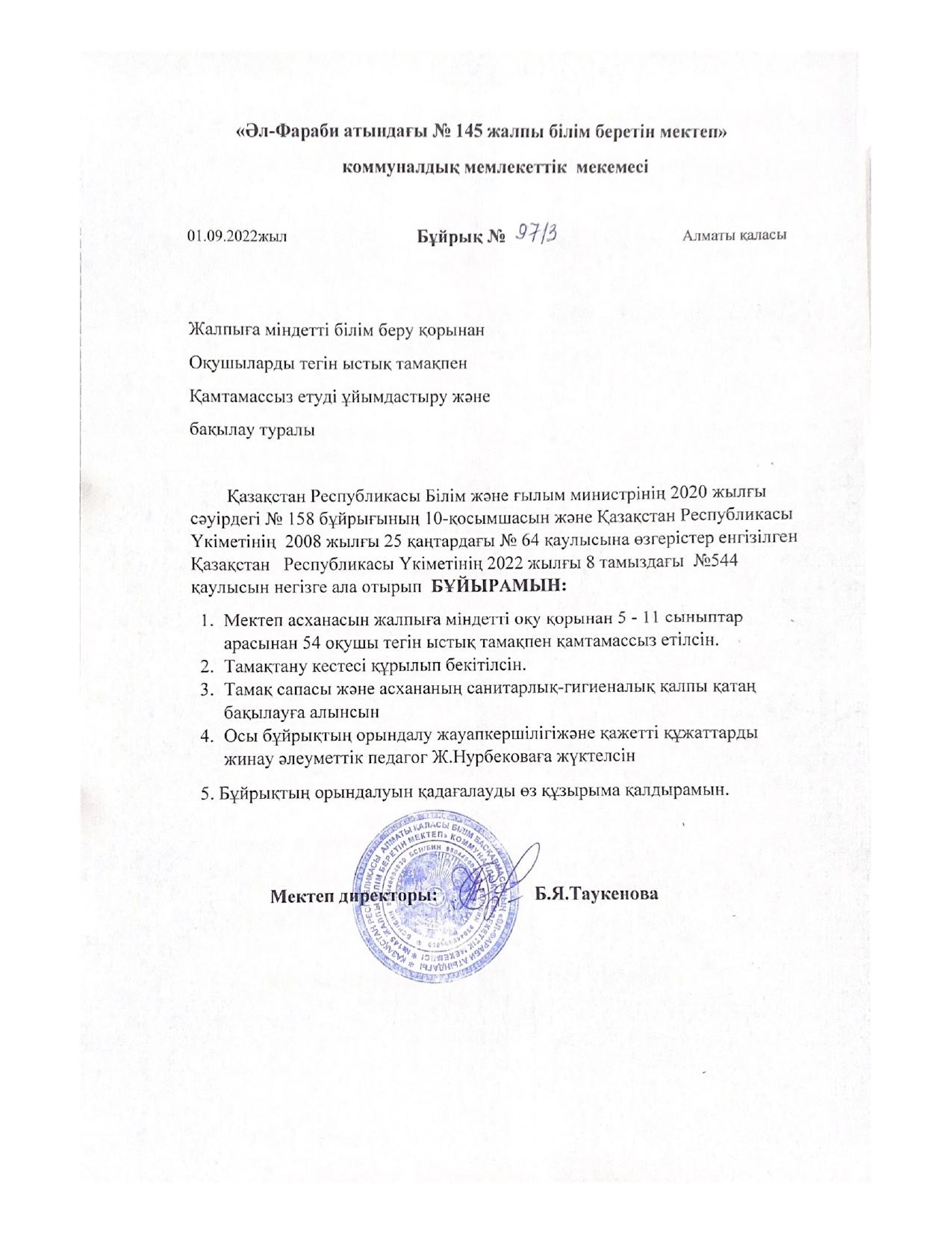 01 сентябрь 2022 0 1 2 3 4 5 Жалпыға міндетті білім беру қорынан оқушыларды тегін ыстық тамақпен қамтамасыз етуді ұйымдастыру және бақылау туралы Бұйрық 2022-2023 оқу жылы Осы беттің QR-коды:QR-код этой страницы: