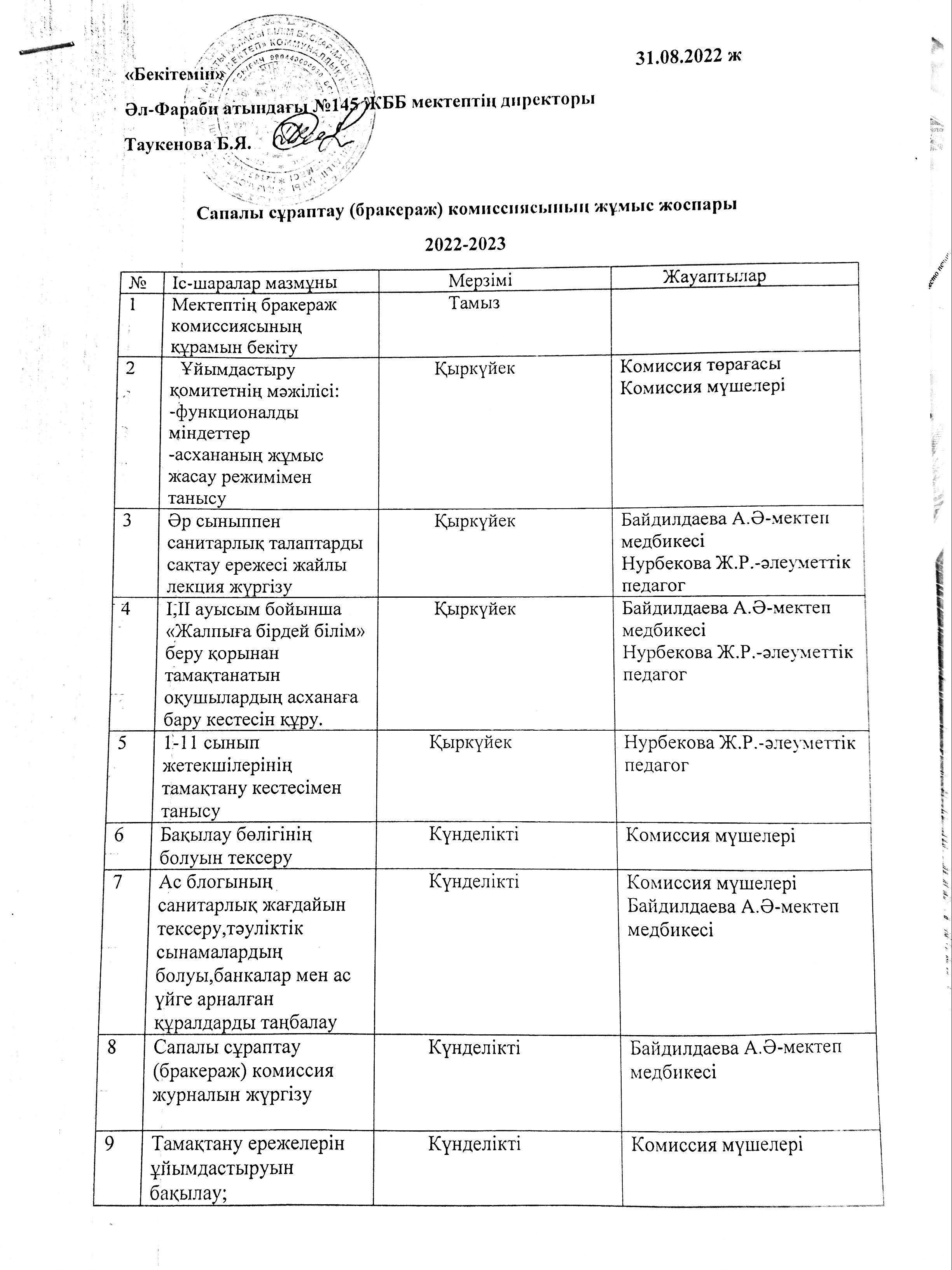 Сапалы сұрыптау (бракераж) комиссиясының жұмыс жоспары