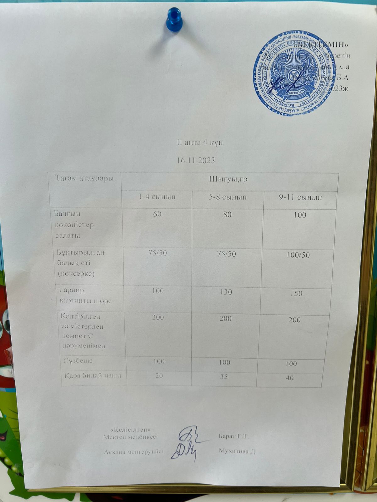 1 күндік ас мәзірі. І апта 5 күн