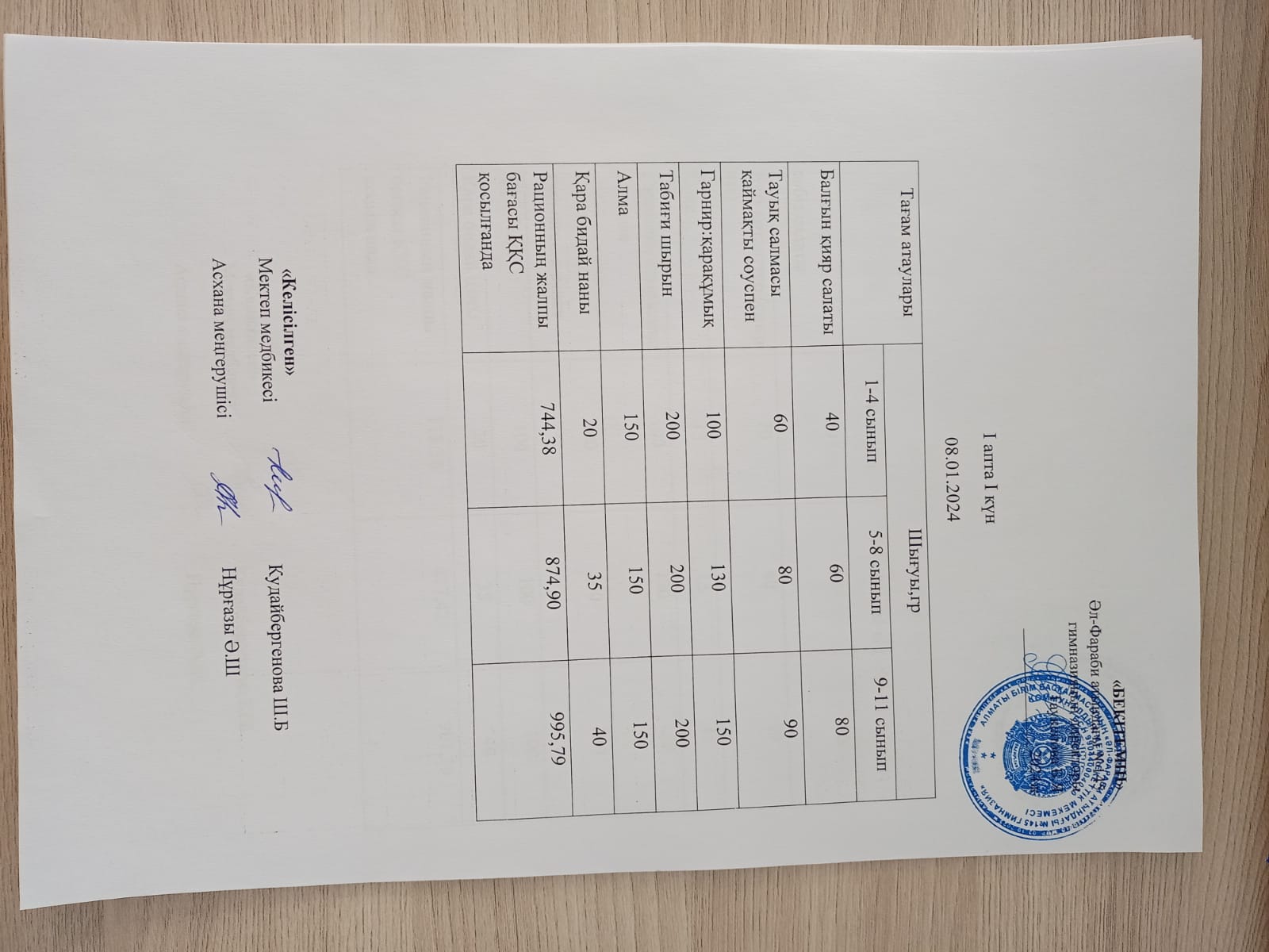 1 күндік ас мәзірі. І апта 2 күн
