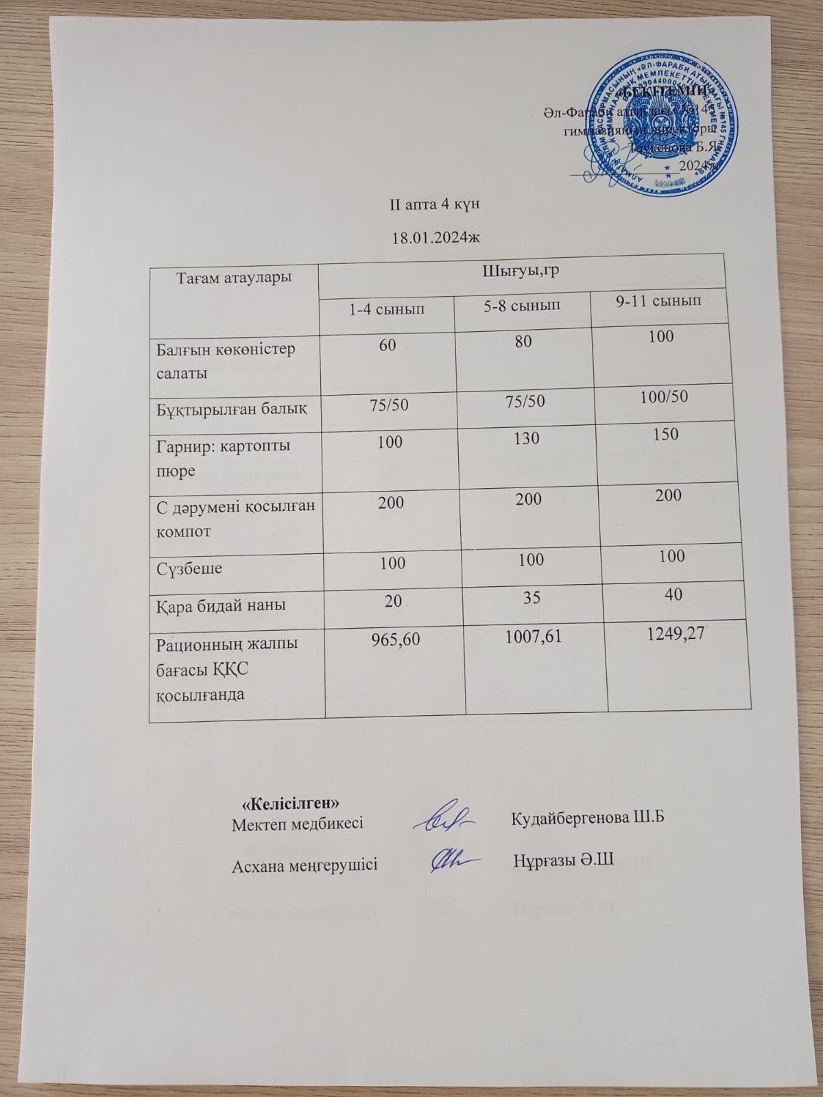 1 күндік ас мәзірі IV апта 4 күн