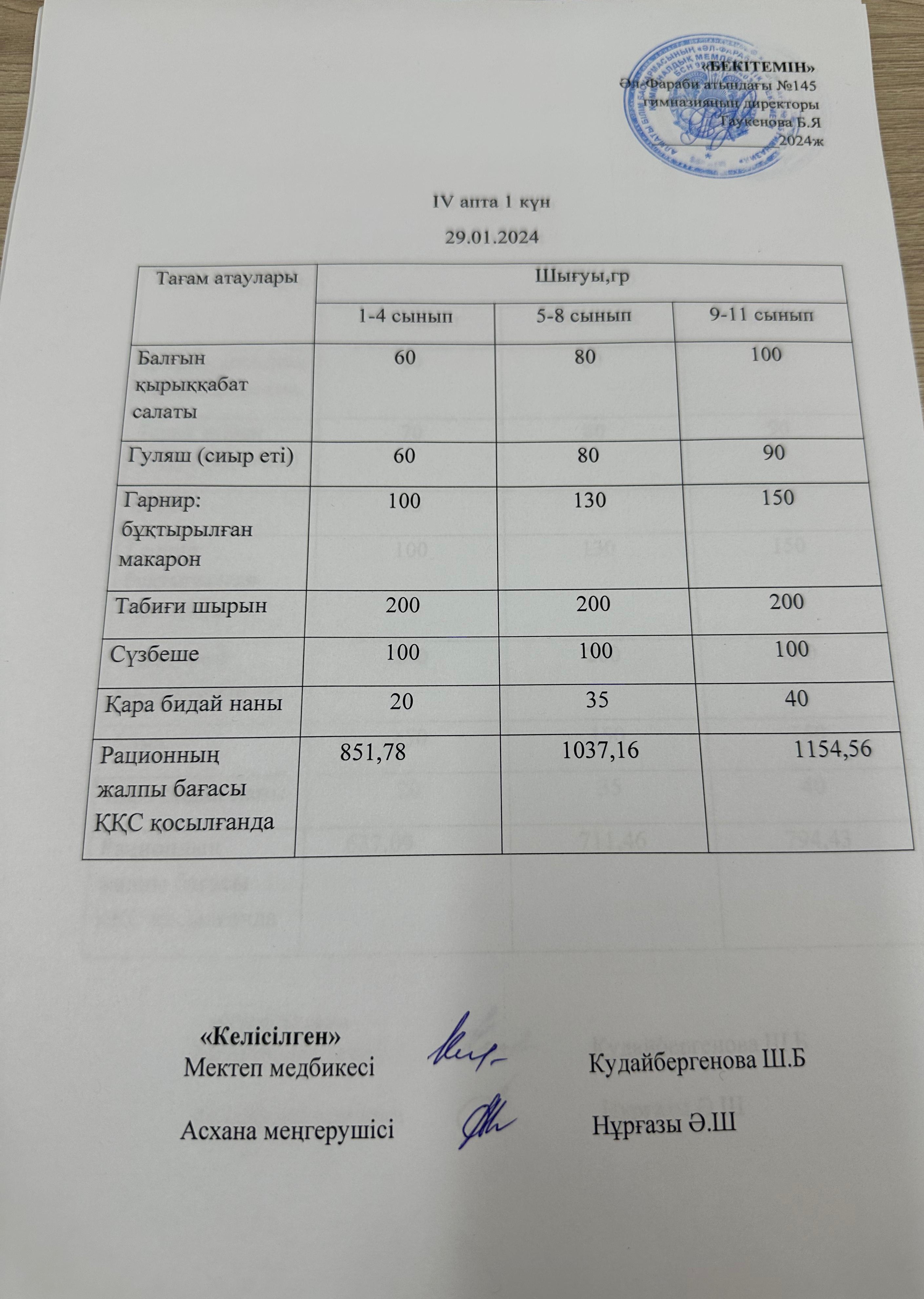 1 күндік ас мәзірі ІІІ апта 4 күн